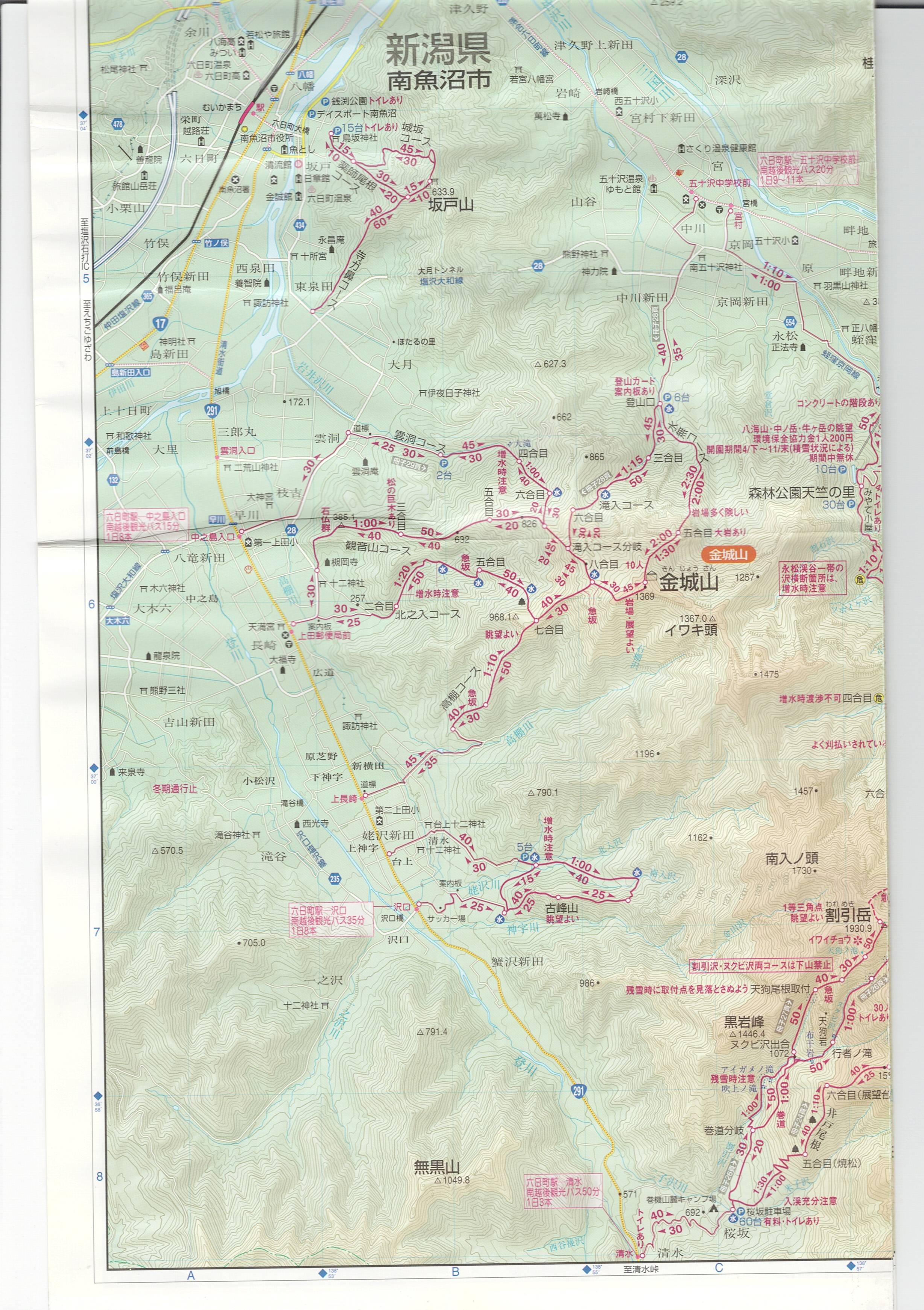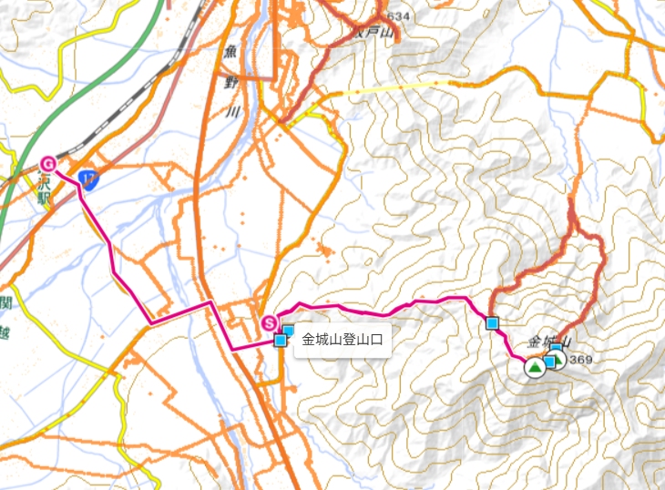 金城山(新潟県)のルートですが、「らくルート」だと西からの観音山ルート、北側の水無コース・滝入コースの3ルートが自動で線が引けます。他に「みんなの足跡(夏)」がないのでルートとしてはこの3つかなと思ってました。