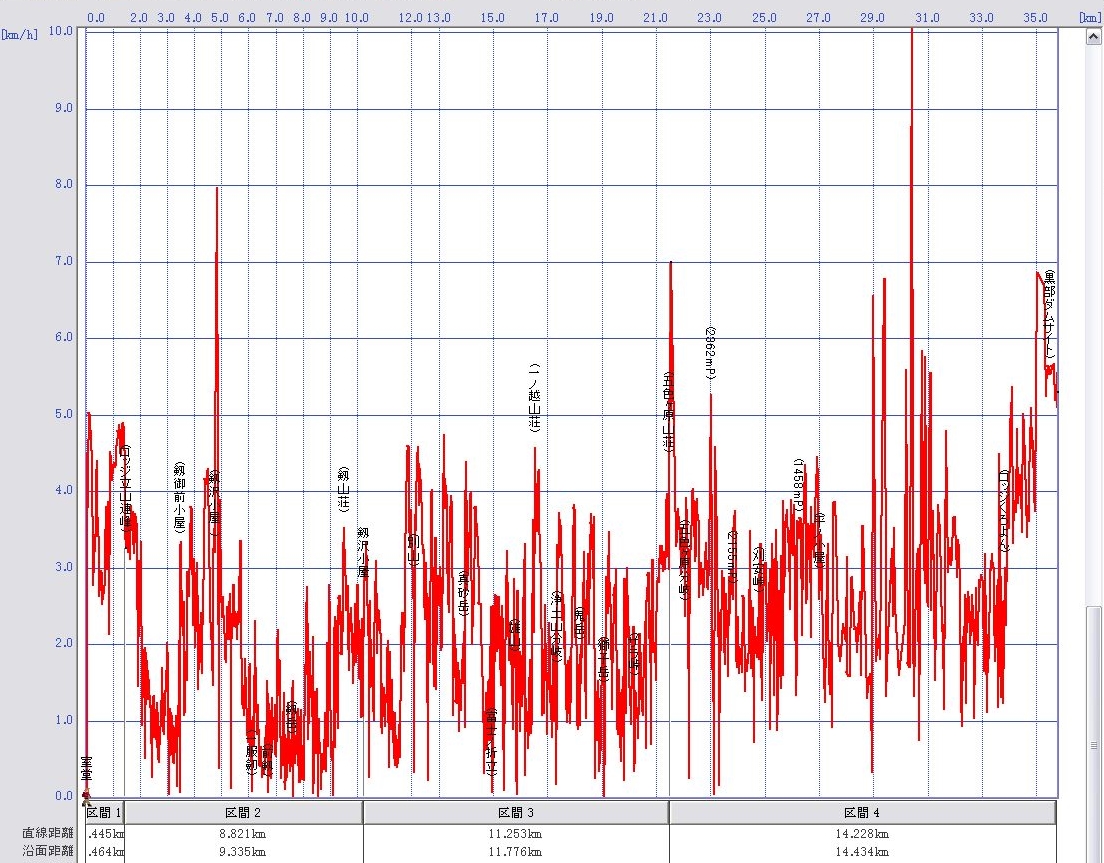 GPS記録 by 「カシミール3D」 縦走路の速度の変化
