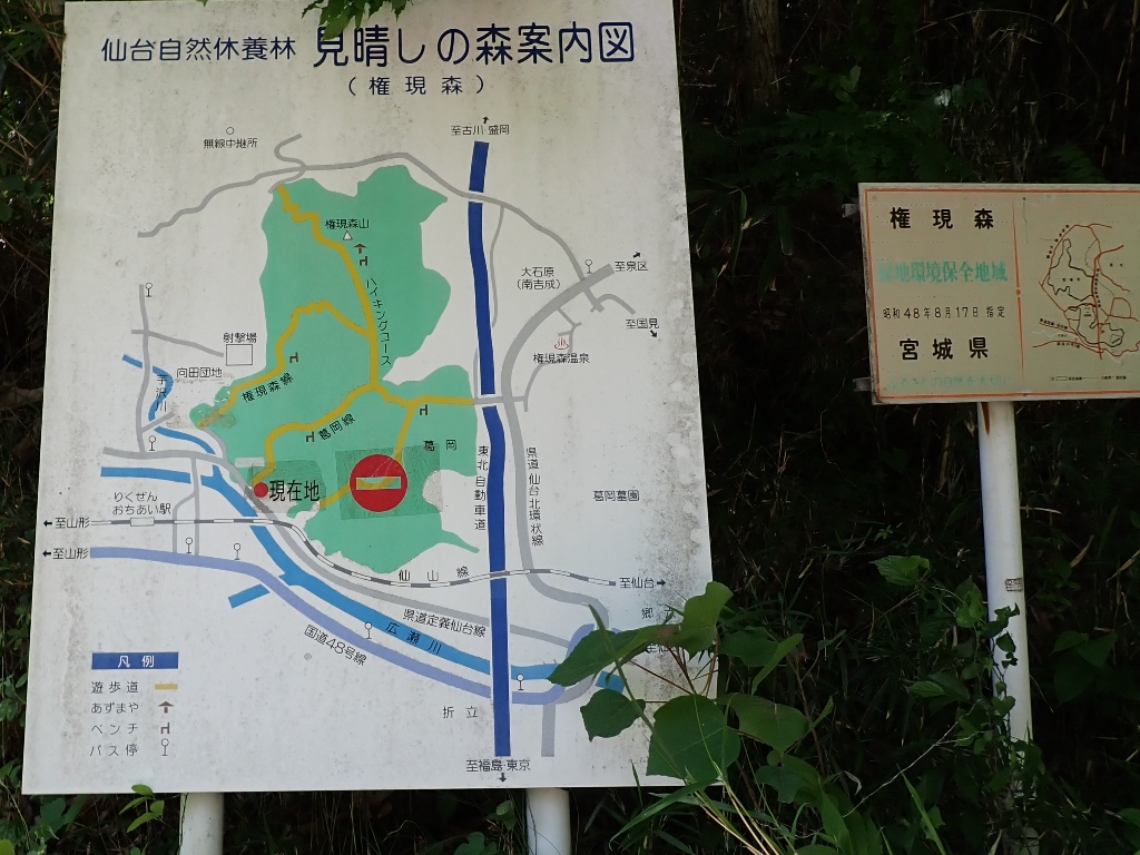 近くの踏切に迂回しても道は存在しないので、1本西側の道から登ったが、登山口に掲示されていた案内図によると、そもそもその道は進入禁止マークが付いていたので、ヤマレコ側のメンテナンス不足であることが判明。(添付写真「権現森案内図」参照)