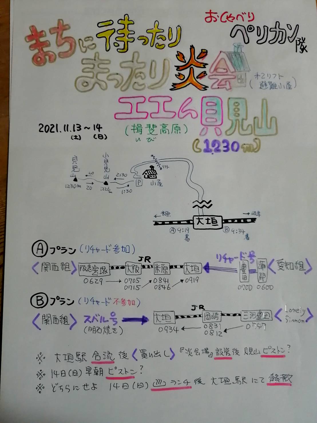 貝月山避難小屋 発 温泉・ランチ後 大垣駅解散