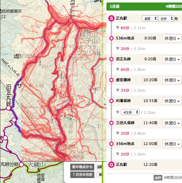 08:00 正丸駅 - 08:20 356m地点 - 08:50 三田久保峠 - 10:20 刈場坂峠 - 10:45 虚空蔵峠 - 11:45 旧正丸峠 - 12:00 536m地点 - 12:50 正丸駅