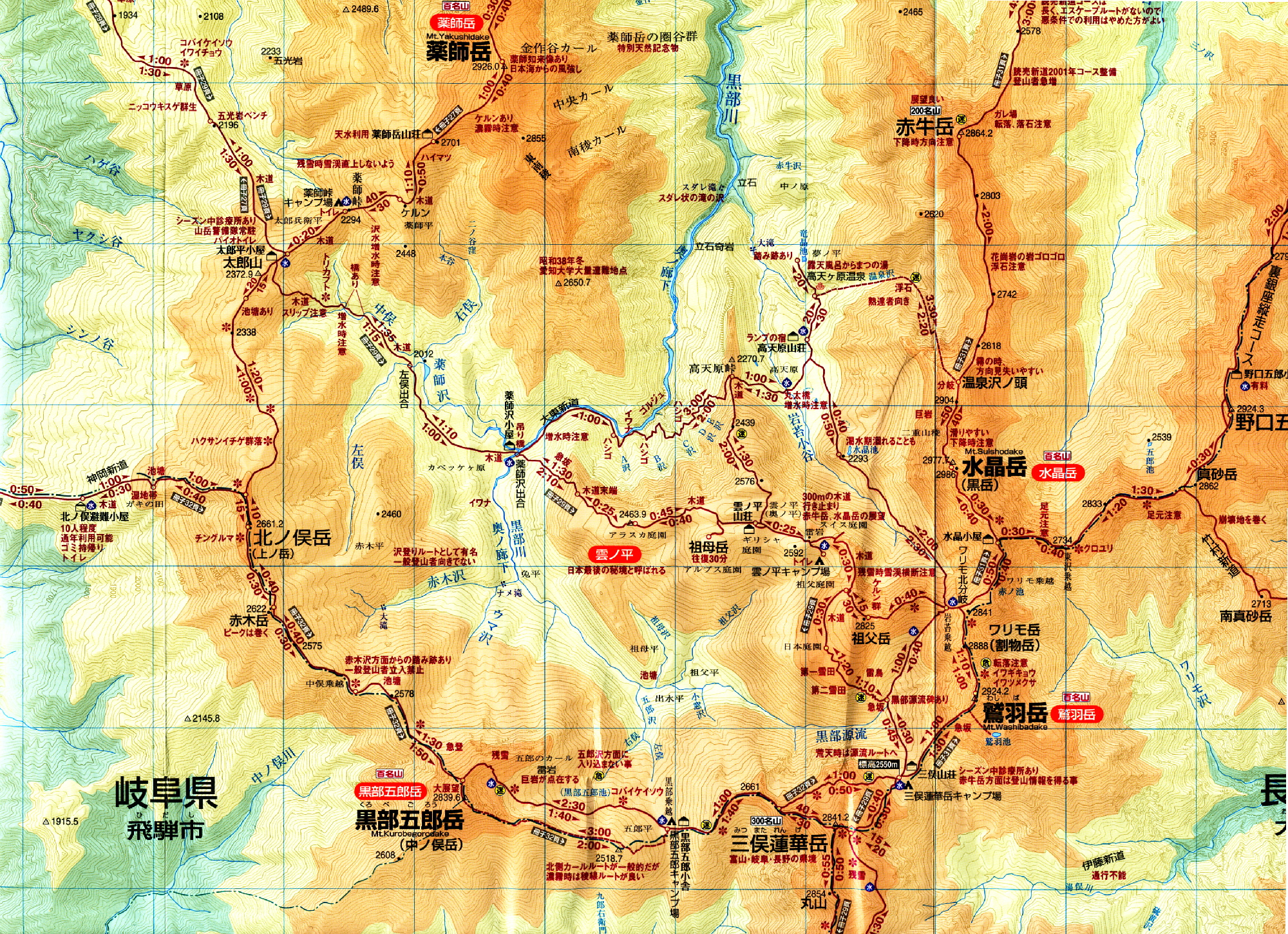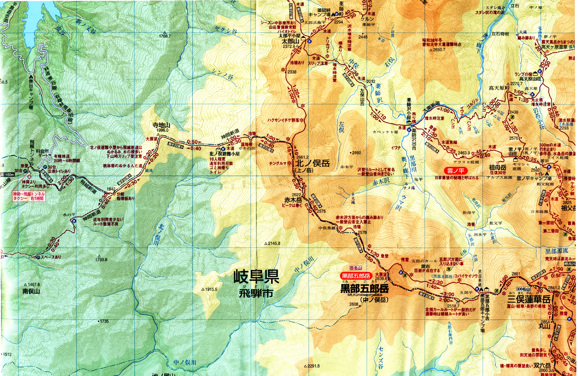 名神高速道路 と 東海北陸自動車道、375km、6時間12分 早朝出発し、昼に現地・登山口P着 ここから北の俣岳避難小屋まで4時間半、ここで泊 |