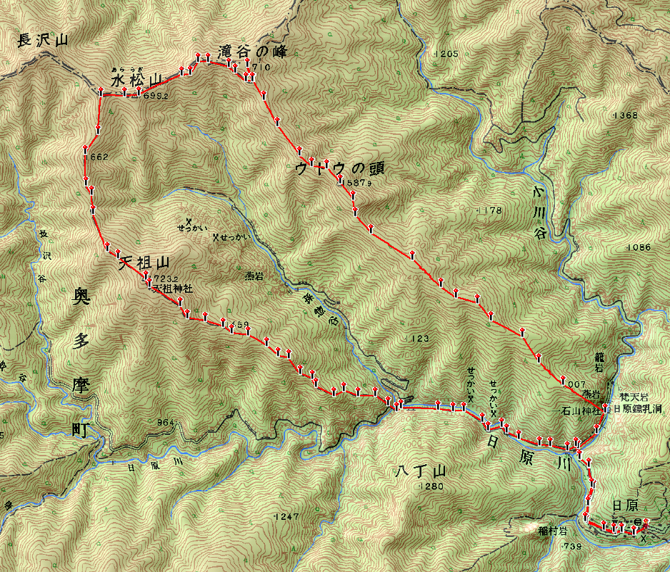 【★タワ尾根(赤破線経路)★】東日原バス停-一石山神社-一石山-人形山-金袋山-篶坂ノ丸-ウトウノ頭(奥多摩/Vルート)
