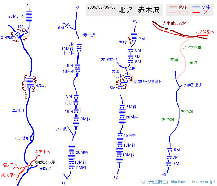 5:00薬師沢小屋-7:00赤木沢出合-10:45大滝下11:15-12:15二股-13:15稜線(装備解除)14:15-14:45北ノ俣岳-16:00太郎平小屋